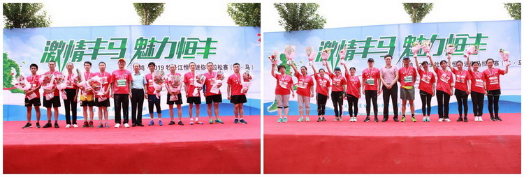 在热烈的掌声中,牡丹江市体育局领导和公司领导共同为获得汇鸿·2019牡丹江恒丰迷你马拉松(丰·马)赛五公里赛男子组、女子组前10名的选手颁发了奖牌并合影留念,赛事组委会现场为所有参加本次活动的选手颁发了完赛奖牌。
